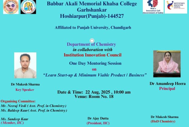 The Department of Chemistry of Babbar Akali Memorial Khalsa College, Garhshankar, in collaboration with the Institution Innovation Council (IIC), organized a One Day Mentoring Session on “Learn Start-up & Minimum Viable Product / Business” on 22nd August ,2025 at 10:00 am in Room No. 18. The event was held under the able guidance of the […]