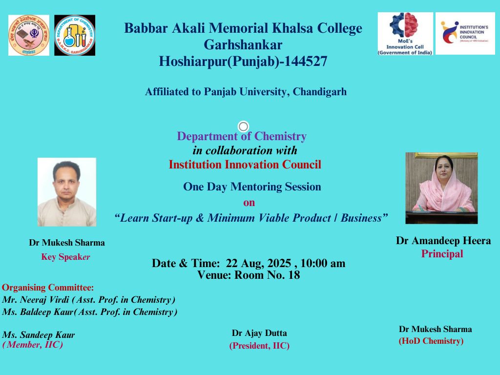 The Department of Chemistry of Babbar Akali Memorial Khalsa College, Garhshankar, in collaboration with the Institution Innovation Council (IIC), organized a One Day Mentoring Session on “Learn Start-up & Minimum Viable Product / Business” on 22nd August ,2025 at 10:00 am in Room No. 18. The event was held under the able guidance of the Principal, Dr. Amandeep Heera. The keynote address was delivered by Dr. Mukesh Sharma, Head of the Department of Chemistry, who shared valuable insights on entrepreneurship, start-up culture, and the importance of developing a minimum viable product (MVP) before launching a business venture. The session witnessed active participation with 30 students and 10 faculty members in attendance. The interactive discussions provided the participants with knowledge of innovation, idea development, and the roadmap to successful entrepreneurship. The organizing committee members—Mr. Neeraj Virdi (Assistant Professor, Chemistry), Ms. Baldeep Kaur (Assistant Professor, Chemistry), and Ms. Sandeep Kaur (Member, IIC)—worked diligently to make the session a success. The event concluded with an interactive Q&A session, where students and faculty exchanged ideas with the speaker. The participants appreciated the initiative, highlighting its relevance in today’s innovation-driven environment.