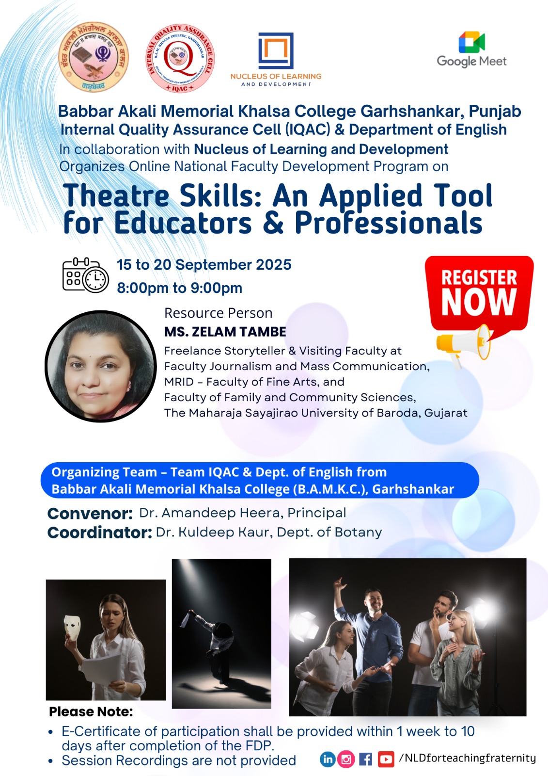 Under the guidance of Principal Dr Amandeep Heera, Department of English & IQAC have organised a National Level FDP on Theatre Skills: An Applied Tool for Educators and Professionals.